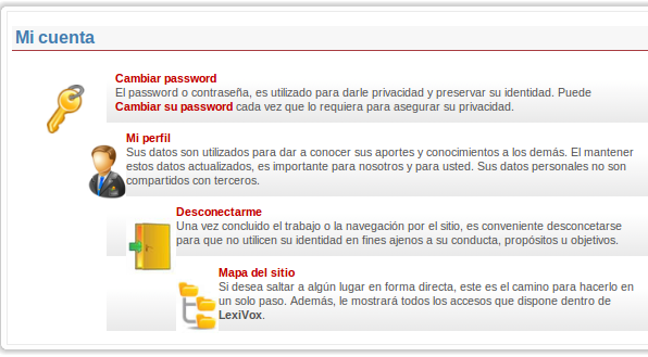 Permite modificar los datos de un usuario, desde datos personales hasta la contraseña de ingreso al sistema. Adicionalmente, presenta opciones de acceso rápido, como ser el mapa del sitio y la opción para desconectarse del sistema.